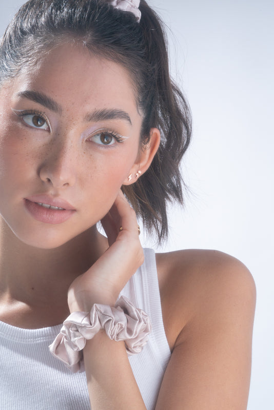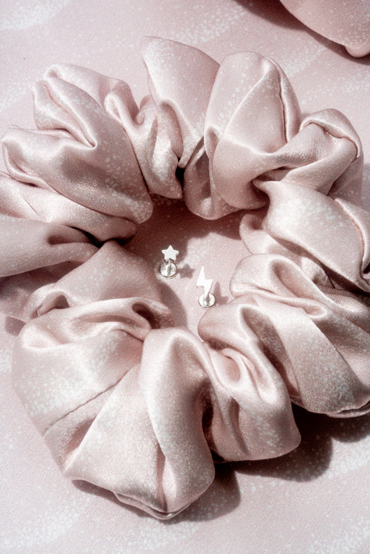 From COSMIC SLUMBER, our collaboration with Mei-Mei Moon. Scrumptiously soft and gentle, this classic silk scrunchie is everything you want and need in a hair accessory. A 1.5-inch-wide band of silk in exclusive print Moon Dust is hand-sewn around extra durable elastic. Silk’s naturally gentle and moisturizing properties will leave your hair free of kinks, creases, friction damage, and breakage. Please note: silk accessories are Final Sale.