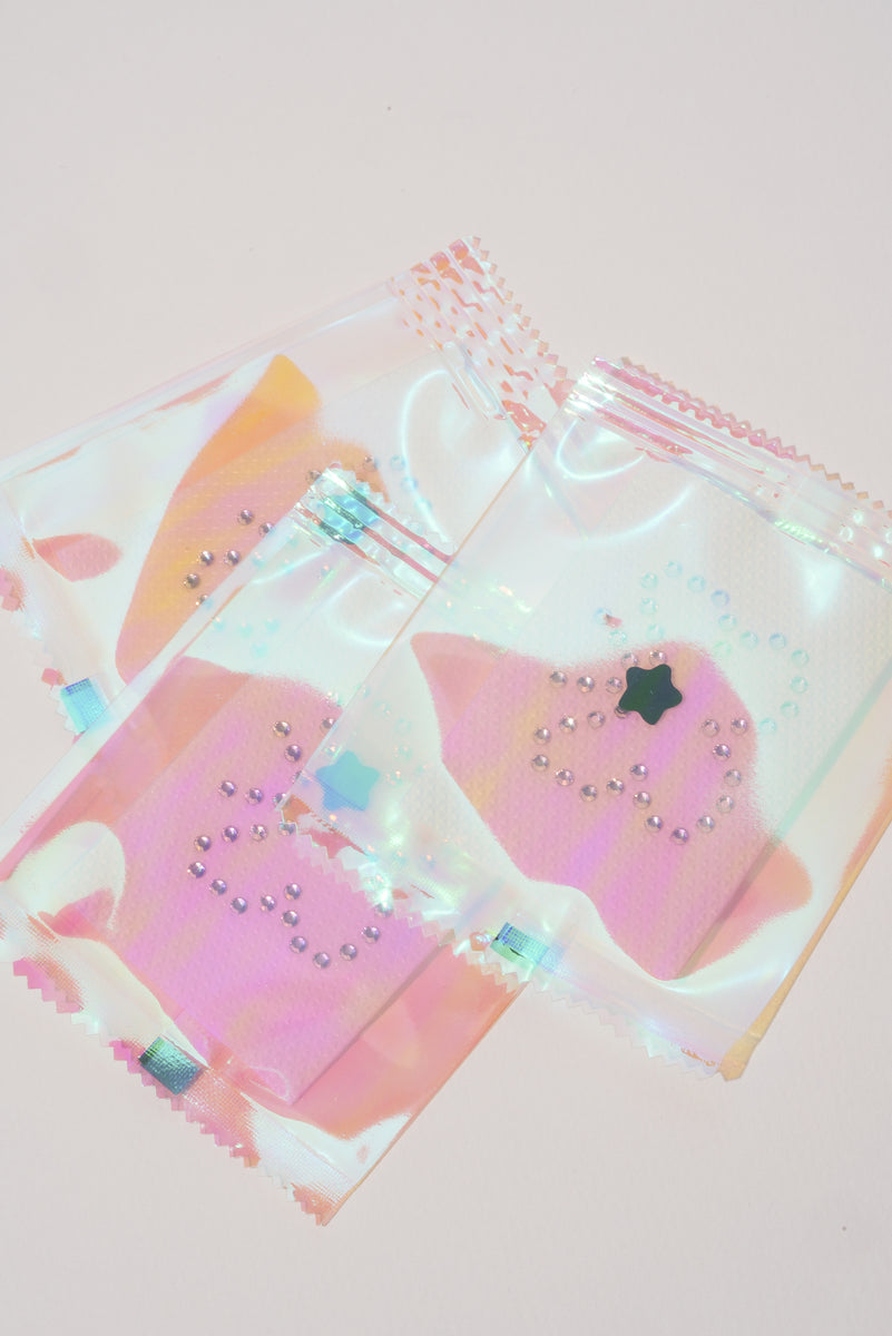 Bringing the fun and nostalgia of Y2K tattoo dispenser toys from the late ’90s/early 2000s, this is a true vintage Swarovski crystal tattoo. Gently pull from the wrapper to apply to clean skin, notebooks, tech. Tattoos are non-exchangeable and non-refundable.