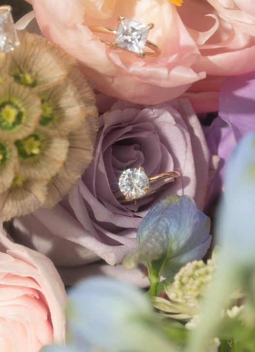 The Oval, Round, and Square are designed with classic profiles — their heights match their carat size and sit farther out from the finger. The Rectangle and Pear are designed with a lower profile setting, sitting closer to the finger, for those wishing for worry-free wear (a common concern for those who wish to avoid scratching young children but desire a ring as part of their style identity). Every ring is set with prongs in a cage setting, lifting the scintillating center stone above a clean, minimalistic band, catching light and refracting fire.