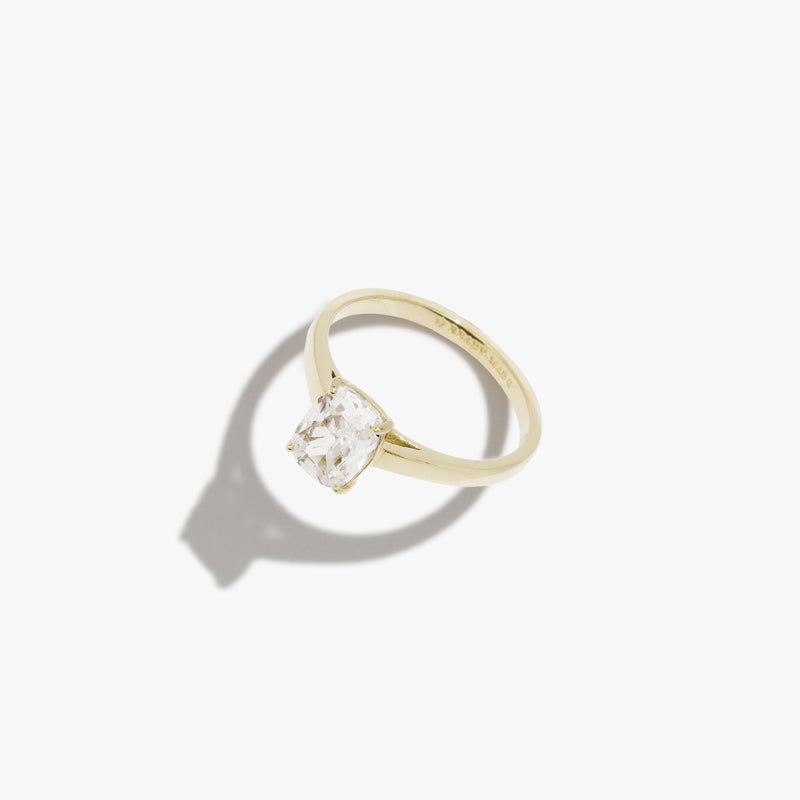 A cushion cut sparkler in our smallest stone from our Promise Ring 2.0 Collection. Sized for daily life, real-looking, and cute. Hand set with a hand-cut 5A Cubic Zirconia (so it never yellows or loses luster), and available in sizes 4-13. Fits true to size. Comes in a luxurious, cushiony soft star-stamped, velvet cream pouch.